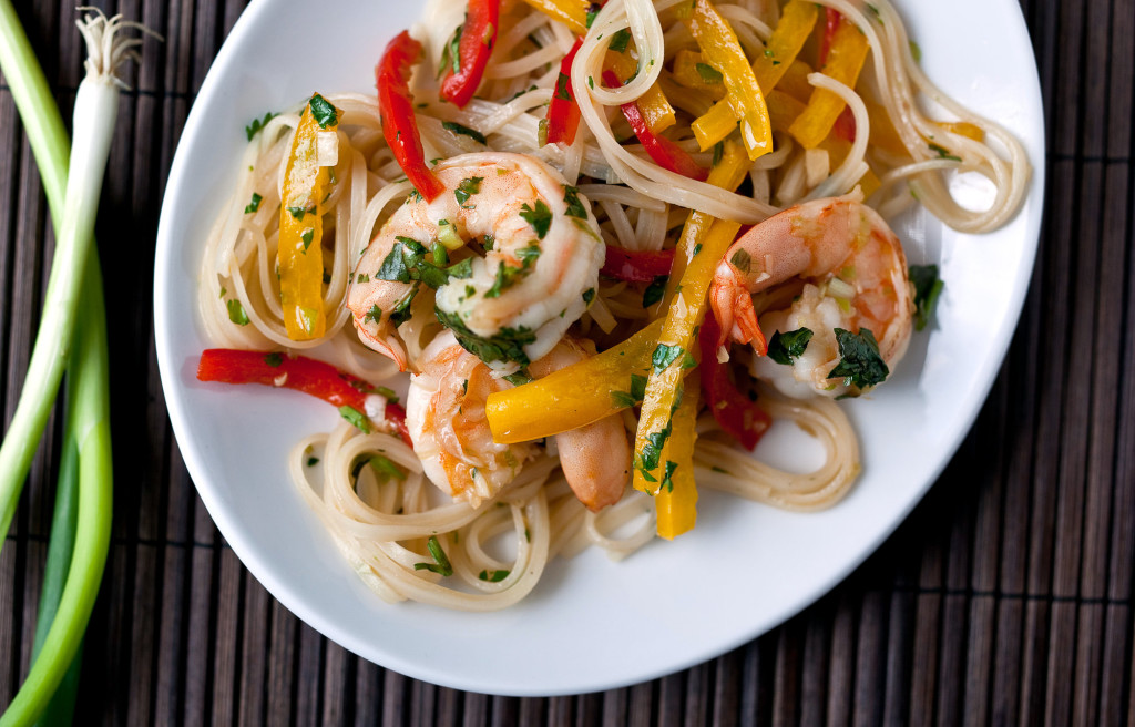 - Heat a 14-inch flat-bottomed wok or a 12-inch skillet over high heat until a drop of water evaporates from the surface within a second or two. Add the oil to the sides of the pan and tilt the pan to distribute. Add the garlic, ginger and jalapeño, and stir-fry for no more than 10 seconds. Add the peppers and stir-fry for one minute. Add the shrimp along with any liquid in the bowl, and stir-fry for two to three minutes until pink and opaque. Add the scallions, drained noodles and the broth mixture, and stir-fry for one to two minutes until the noodles are just tender. Add the cilantro and stir-fry for another 30 seconds. Stir in the sesame oil, remove from the heat and serve, with more soy sauce if desired.