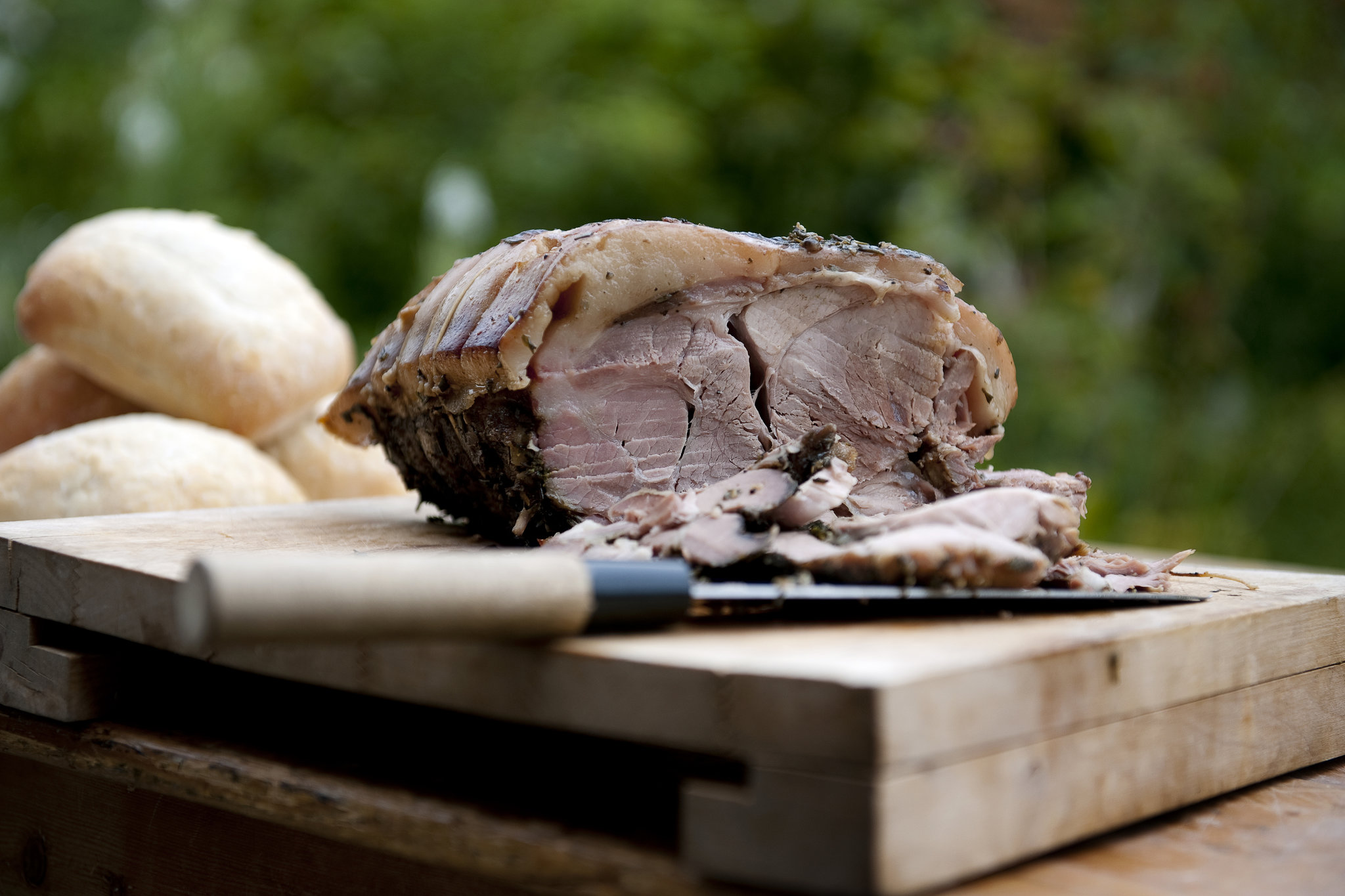 - Heat the oven to 225 degrees. Prepare a triple layer of aluminum foil large enough to comfortably enclose the pork. Put the rolled pork on the foil, skin/fatty side up. Gather the foil, scrunching it over to form a loose but well-sealed parcel. Place in a roasting pan in the oven. Take the first check for the internal temperature after 8 hours. For very tender meat that can be sliced, it should be 160 degrees and will probably take 10 hours. Check more often if needed. For a “pulled pork” consistency, the internal temperature should be 200 degrees and it will take about 12 hours.