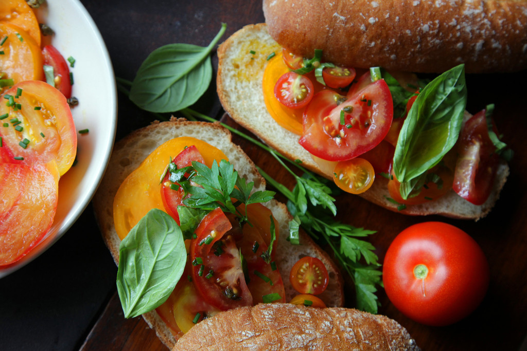 - Split the rolls or baguette lengthwise. Spoon tomato salad and its juices onto bottom of each roll (or bottom half of the baguette). Lay a few basil and parsley leaves over tomatoes. Replace tops and press lightly. If using baguette, cut crosswise into 4 pieces.