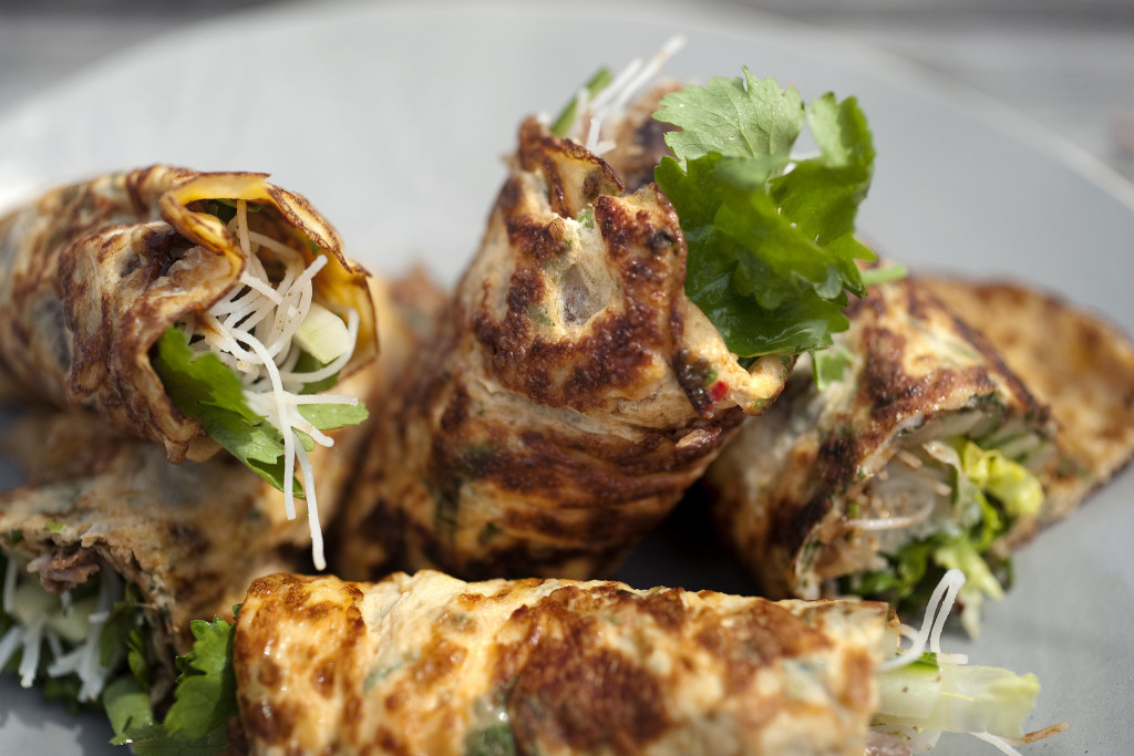 - Lay one omelet golden-side down and spread a tablespoon of hoisin sauce over it. In a line, just off center, lay about a tablespoon of rice noodles, a little duck or chicken, cucumber matchsticks, a few cilantro leaves and a little shredded mint. Roll up as firmly as possible, from the edge nearest the filling ingredients. Cut in half through the middle, and repeat with the remaining omelets and filling.