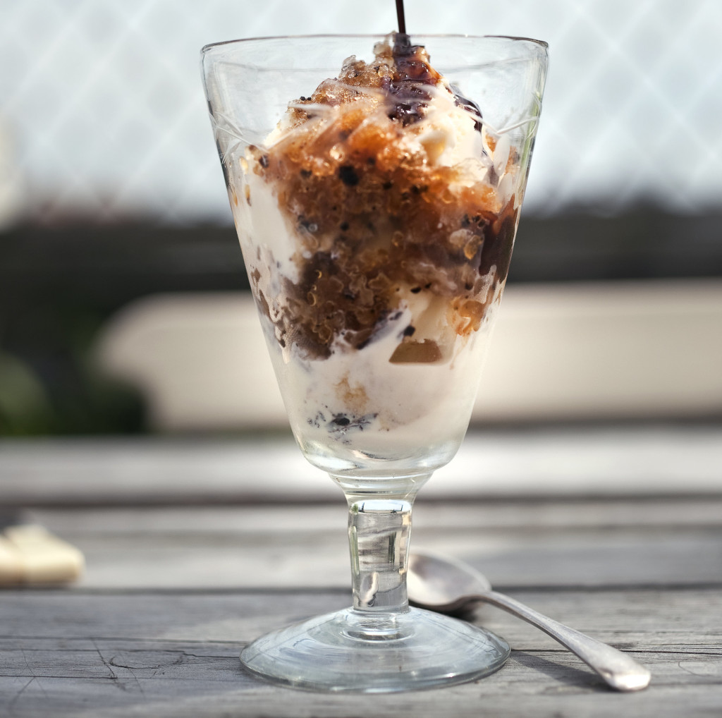 Here, a sort of granita made with very strong coffee is layered with a sweetened cream mixture, and then doused in a chocolatey coffee syrup. It’s a relatively lengthy endeavor, but one well worth doing. The individual parts must be made ahead of time, so plan accordingly.