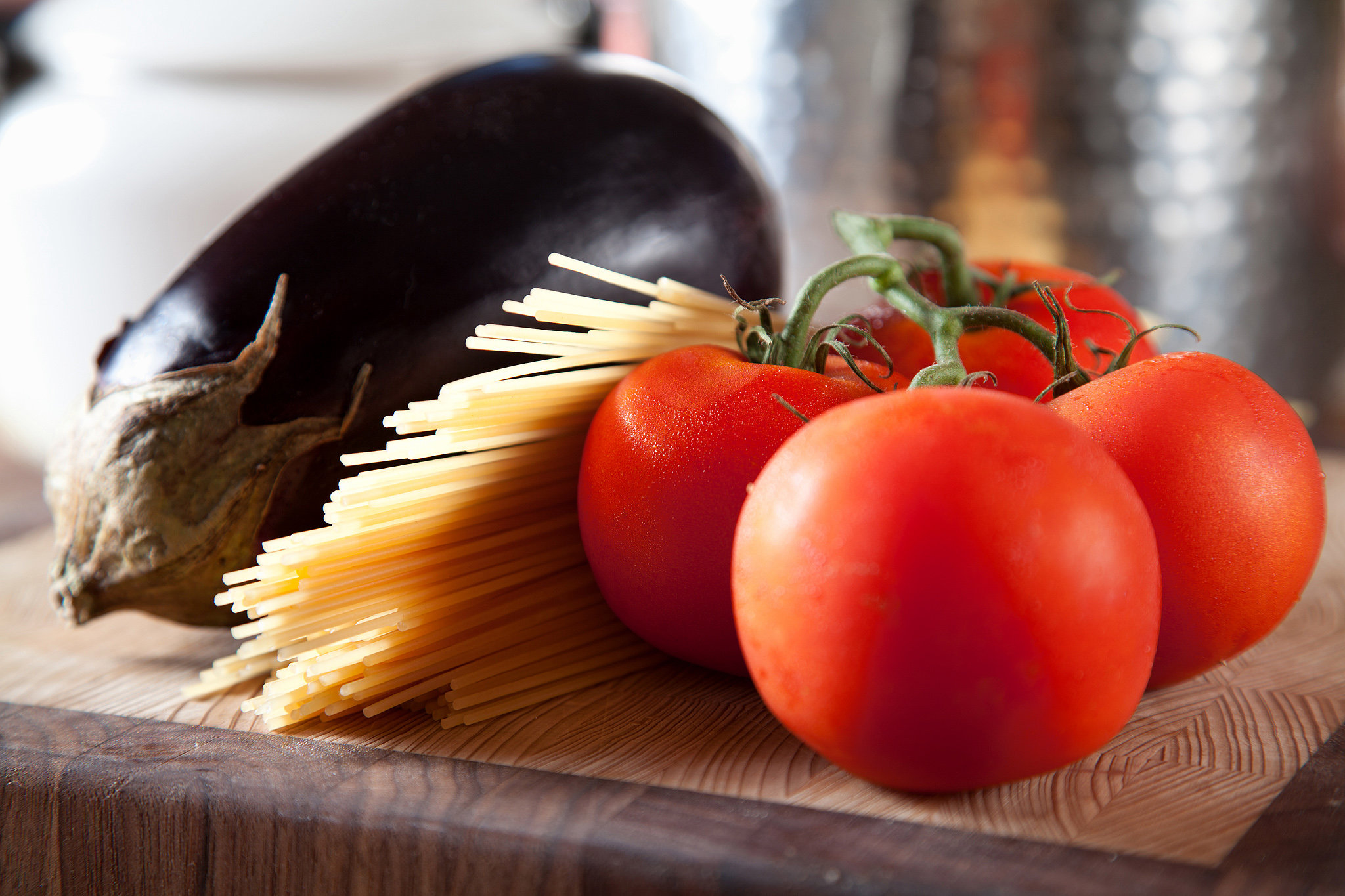 - Bring a pot of salted water to a boil for the spaghetti. Cook until al dente. Drain, reserving about 1/2 cup pasta water. Add pasta to tomato sauce. Return eggplant to pan and cook on low, mixing pasta with sauce ingredients. Add the remaining 2 tablespoons of oil, season with salt and chile if desired and moisten with some pasta water if needed. Divide among plates or shallow bowls, scatter cheese on top and serve.