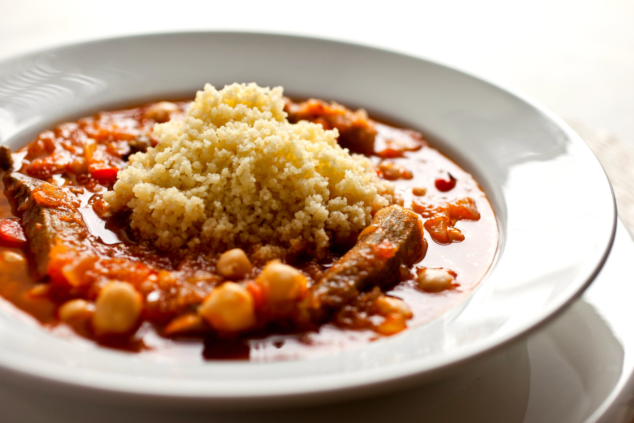 - Reconstitute and steam the couscous [editor please link]. Serve the couscous in wide bowls or mound onto plates and top with the stew. Pass more harissa at the table.