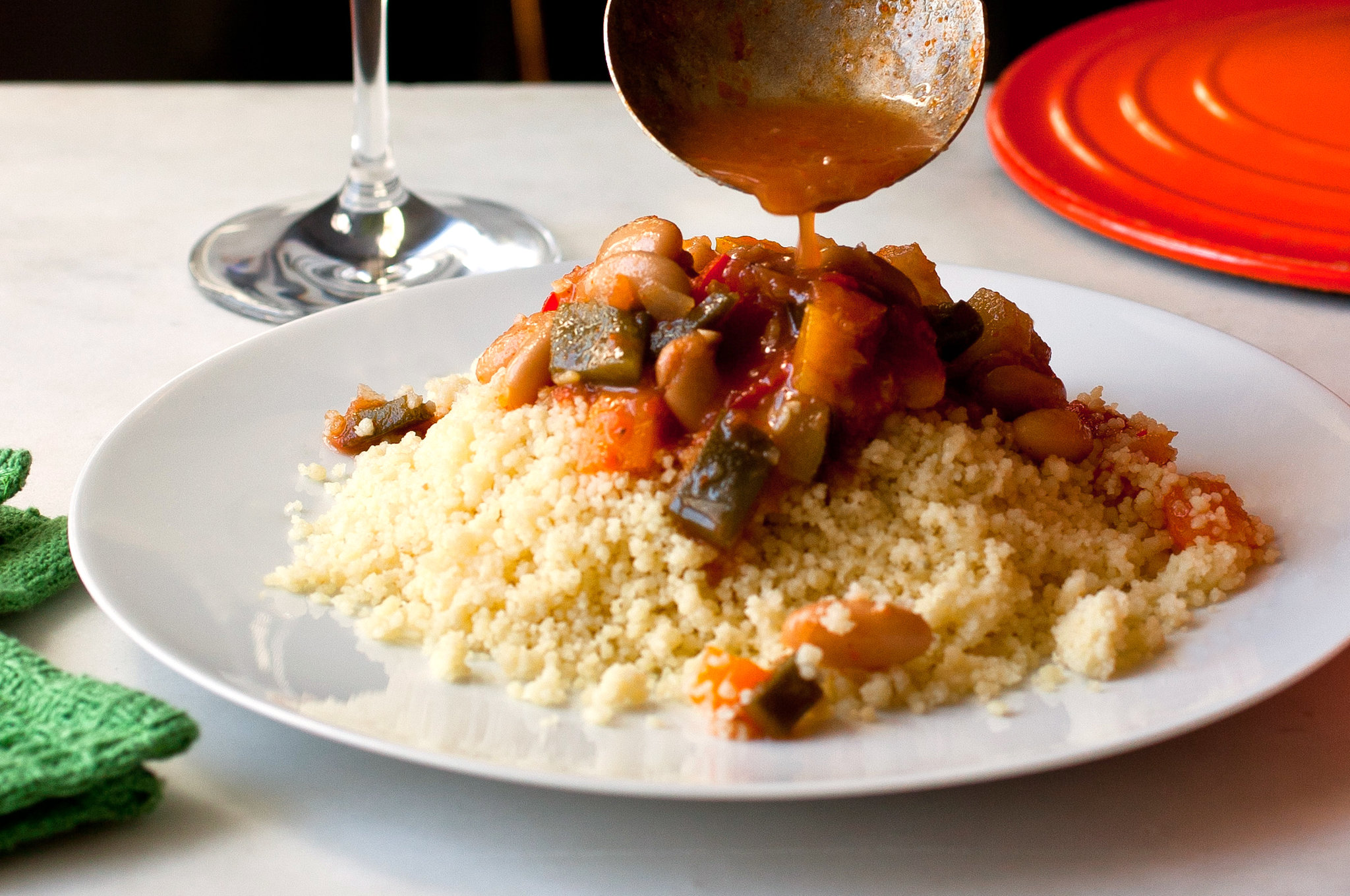 3. Reconstituting and steaming the couscous: In a large microwave-safe bowl, combine the couscous and salt to taste. Drizzle the remaining olive oil over the couscous and add the cup of broth you removed from the stew. Stir well, or moisten your fingers and rub the couscous with them to evenly distribute the oil and broth. Add enough water to cover by 1/2 inch and let sit for 20 minutes, or until all of the liquid is absorbed. Stir every 5 minutes with a wooden spoon or rub the couscous between your moistened thumbs and fingers, so that the couscous doesn’t lump. The couscous will now be fairly soft; fluff it with a fork or with your hands. The traditional way to finish reconstituting the couscous is to place it above the simmering stew for 45 minutes. I find, however, that steaming it in a microwave results in perfectly fluffy couscous. Cover the bowl tightly with plastic and pierce the plastic with the tip of a paring knife. Heat at 100 percent power for 3 minutes. Remove from the microwave carefully and allow it to sit for 1 minute. Carefully remove the plastic and fluff with forks or a spoon. Cover again with plastic and microwave for 2 to 3 more minutes. Be very careful when you remove the plastic, as the couscous will be steamy. You can reconstitute the couscous a day ahead and reheat in the microwave shortly before serving.