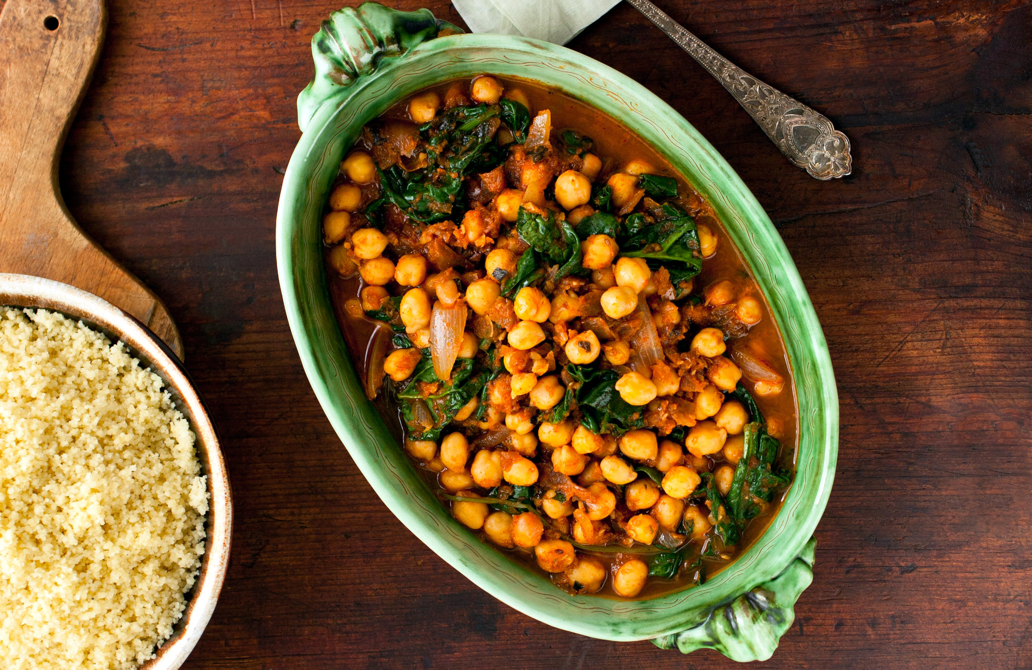 Spinach and chickpeas are a popular combination throughout the Mediterranean. This is one of my favorite couscous tagines. You can also use sturdier greens like chard. If you do use chard, simmer for 10 to 15 minutes rather than the 5 minutes required for spinach.