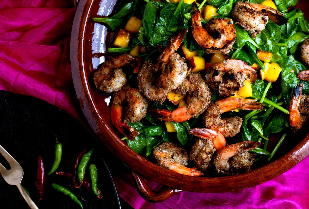 The first principle of Indian spice cookery (and of spices in general) is that spices are best when bought whole and ground fresh, as happens in this recipe. Toasting and then grinding the spices — peppercorns, coriander, mustard seeds and cardamom pods — used for the spice rub helps to even out their flavors so that they blend with the mild flavor of the shrimp. Serve them over fresh ripe peaches and tender spinach wilted by a hot mixture of ginger, vinegar, orange juice and curry powder.
