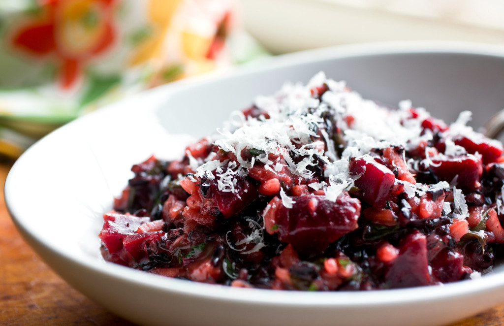 The red from the beets will bleed into the white rice in this nutrient-dense risotto. Both the beets and the black rice contribute anthocyanins, flavonoids with antioxidant properties.