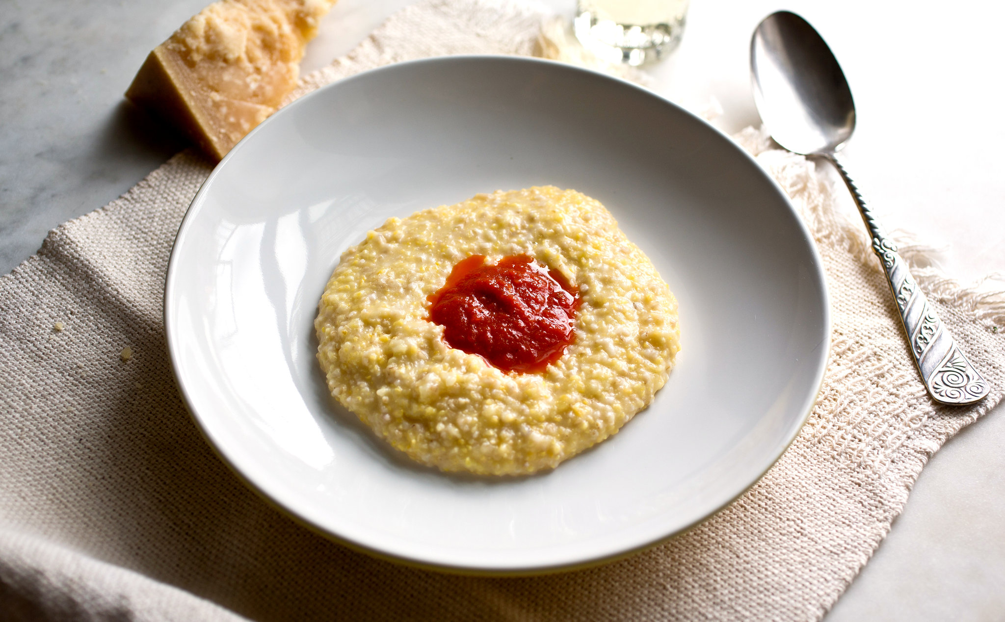 - Spoon the polenta onto plates, make a depression in the middle with the back of your spoon, and fill it with tomato sauce. Top with Parmesan if you haven’t stirred it into the polenta.