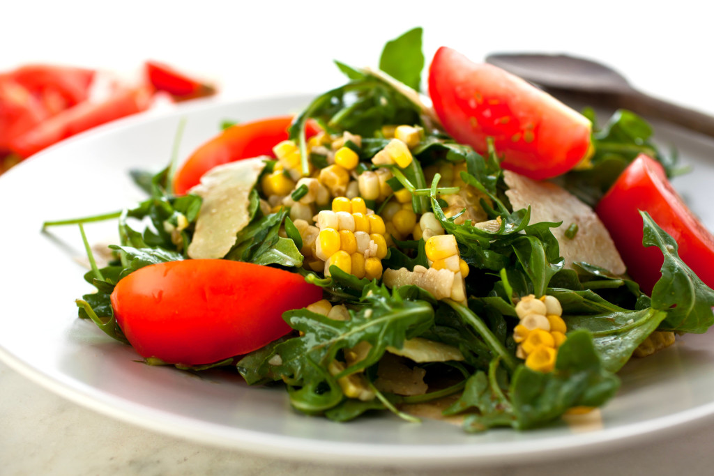 2. Combine the corn, arugula, herbs and Parmesan in a salad bowl. In a small bowl or measuring cup, whisk together the sherry vinegar, balsamic vinegar, Dijon mustard, garlic, salt, pepper and olive oil.
