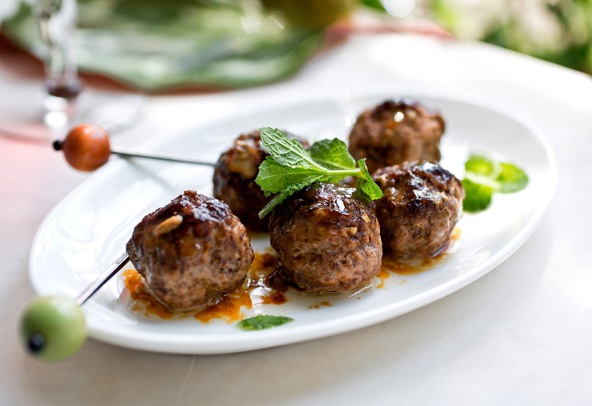- Heat the broiler. Run meatballs under the broiler until golden and just cooked through, about 5 minutes. Brush immediately with pomegranate molasses. Spear with toothpicks, sprinkle with mint and serve.