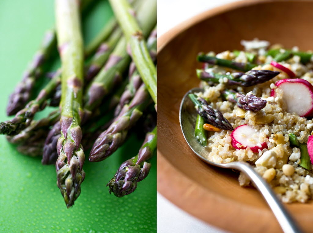- Steam the asparagus for 3 to 4 minutes, until just tender. Rinse with cold water, pat dry and cut on the diagonal into 1-inch pieces. Add to the quinoa, along with the radishes, pine nuts, chives and tarragon.