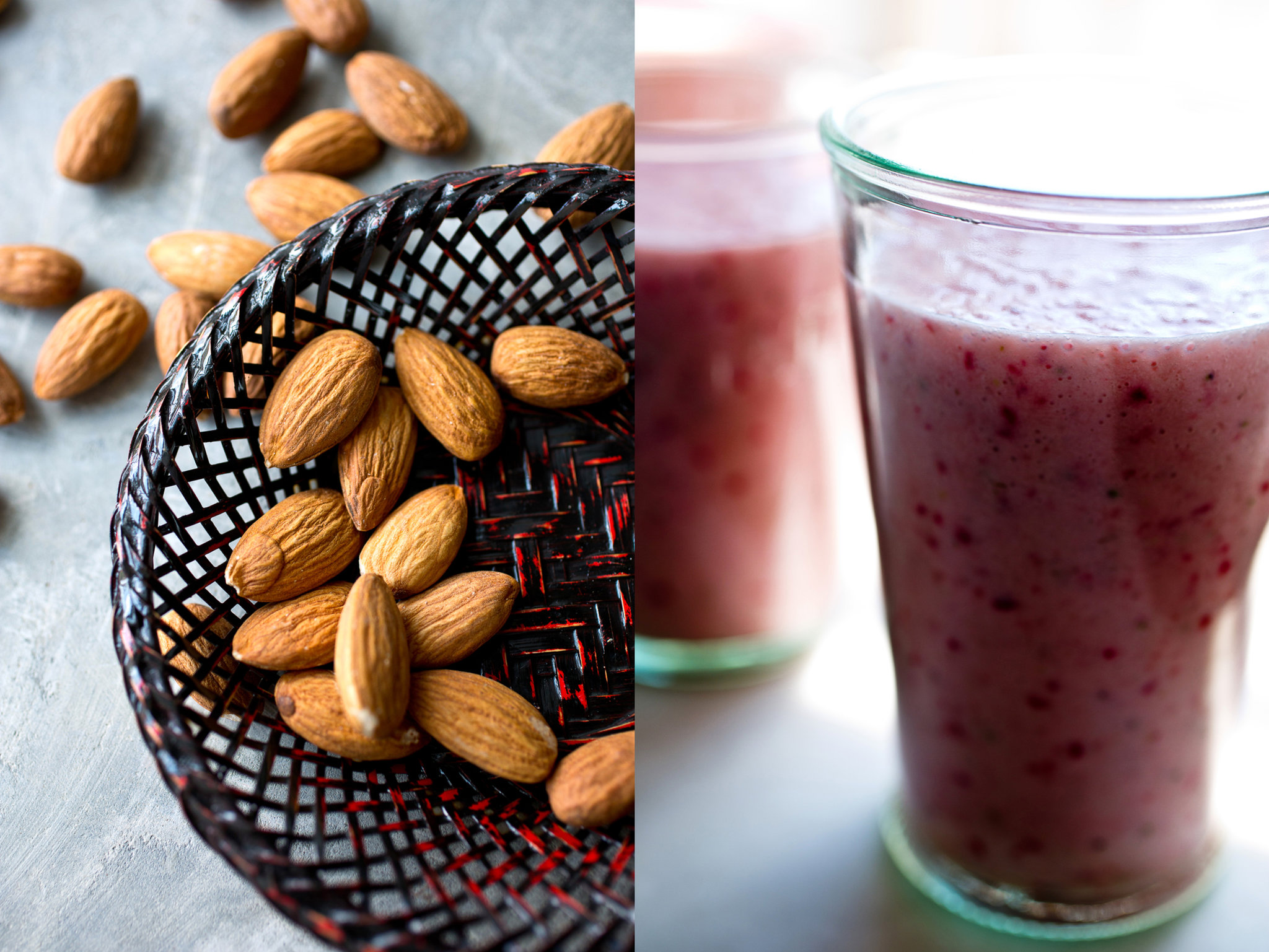 This smoothie is a meal in itself — yet avoids the protein additives and brewer’s yeast popular in the world of bodybuilding. This recipe uses almond powder and requires ripe, sweet strawberries. (Frozen strawberries will work fine.) Substitute other kinds of nuts or nut flour, or other kinds of fruit, at your discretion.