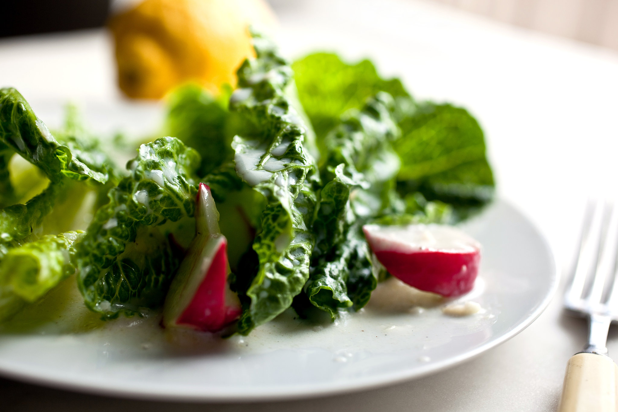 - Combine the romaine, radishes and herbs in a large salad bowl.