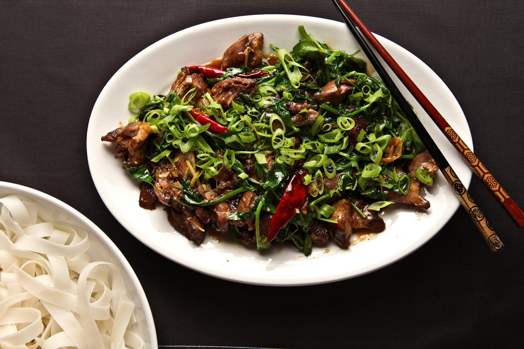 - In a wok or large cast-iron skillet, heat the vegetable oil over high heat. Add the chopped duck meat and let it sizzle, stirring well, until crisp and lightly browned, about 2 minutes. Season lightly with salt. Lower the heat to medium high and add the ginger, garlic, red chile peppers and cumin seed. Stirring frequently, cook for one minute more, taking care not to burn the garlic. Add the rice wine mixture and duck broth and bring to a brisk simmer. Stir in the cornstarch mixture and cook until lightly thickened, 30 seconds or so. Turn off the heat and add the pea shoots, mixing them into the sauce until barely wilted. Transfer to a serving platter and sprinkle with scallions.