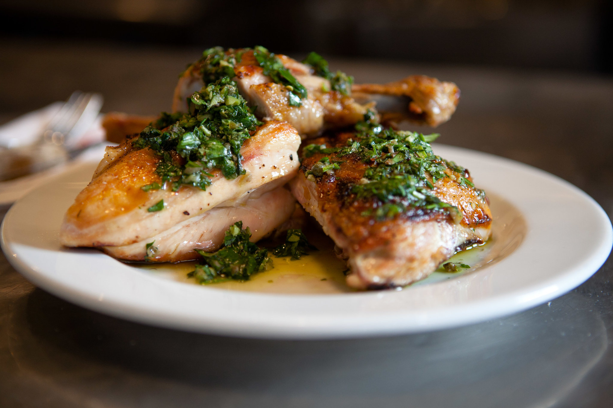 This deceptively unadorned but deeply flavorful roasted chicken is served with a salsa verde of capers, anchovies, garlic, hand-chopped parsley, arugula, basil, tarragon and sage.