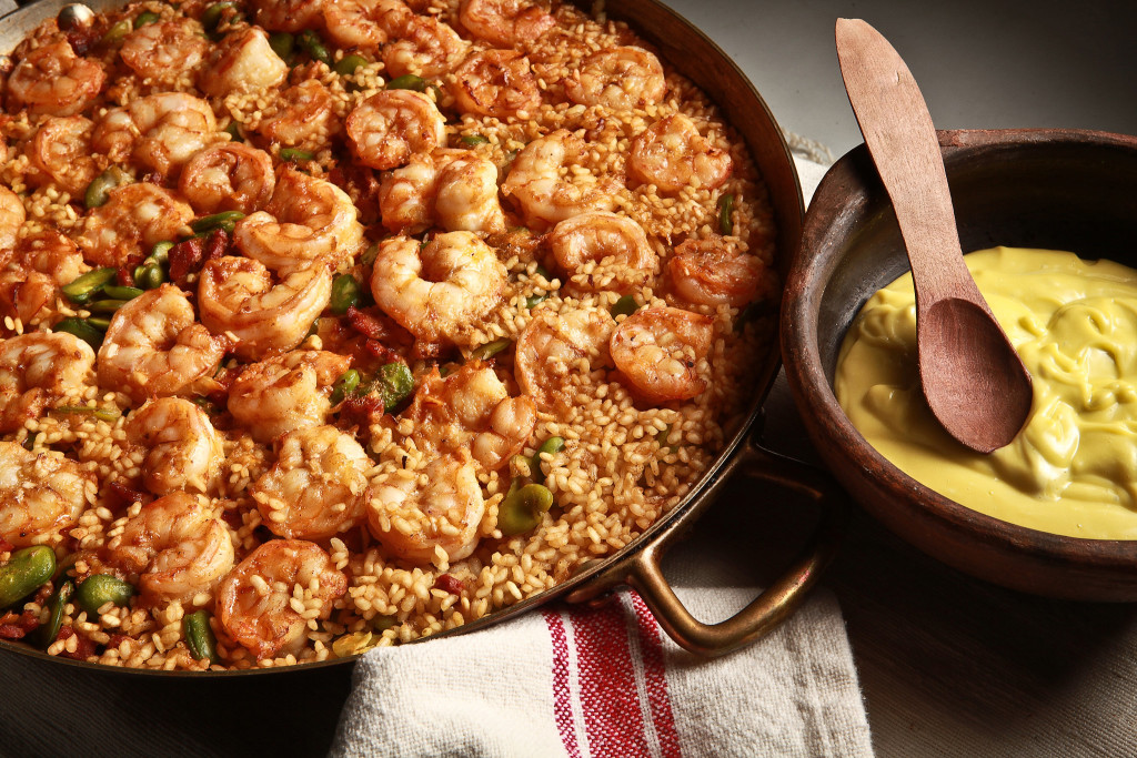 6. Place the pan on the middle rack of the oven and bake for 10 minutes. Remove the pan from the oven and cover with a clean dish cloth. Let the rice rest for 10 minutes before serving. Serve with homemade garlic mayonnaise or aioli if desired.
