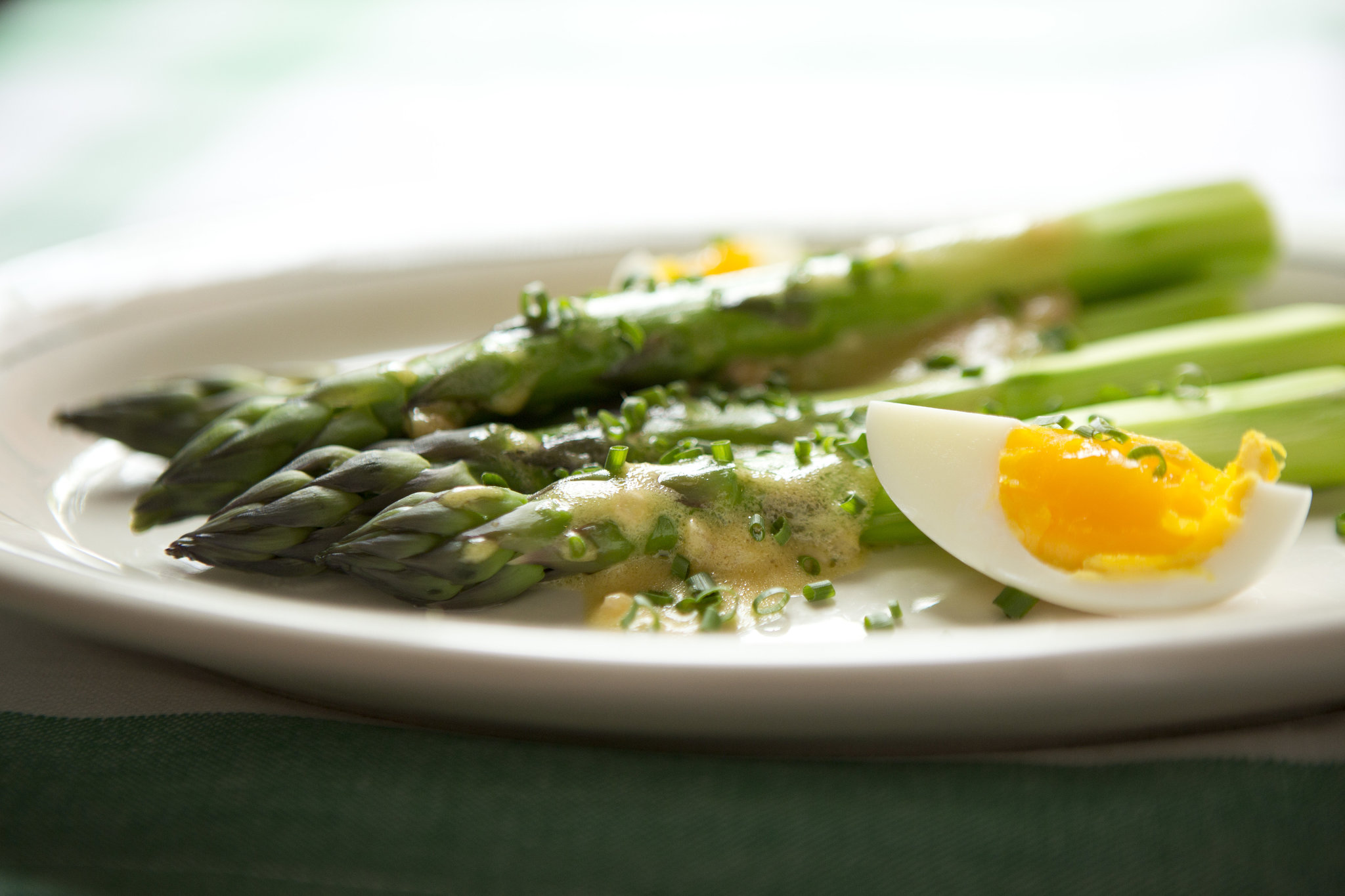 Here is an easy, springtime recipe that takes no time at all and puts the light flavors of the season right onto your table. Cooking time is key: both the asparagus and the eggs must be watched carefully. Arrange everything on a plate beautifully, and throw open the windows to spring.