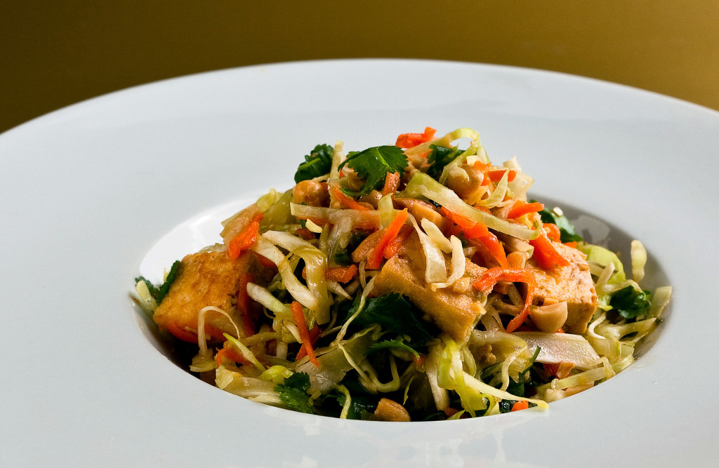 - In a large bowl, toss together tofu, cabbage, carrot, peanuts, cilantro and vinaigrette. Garnish with more peanuts and cilantro.