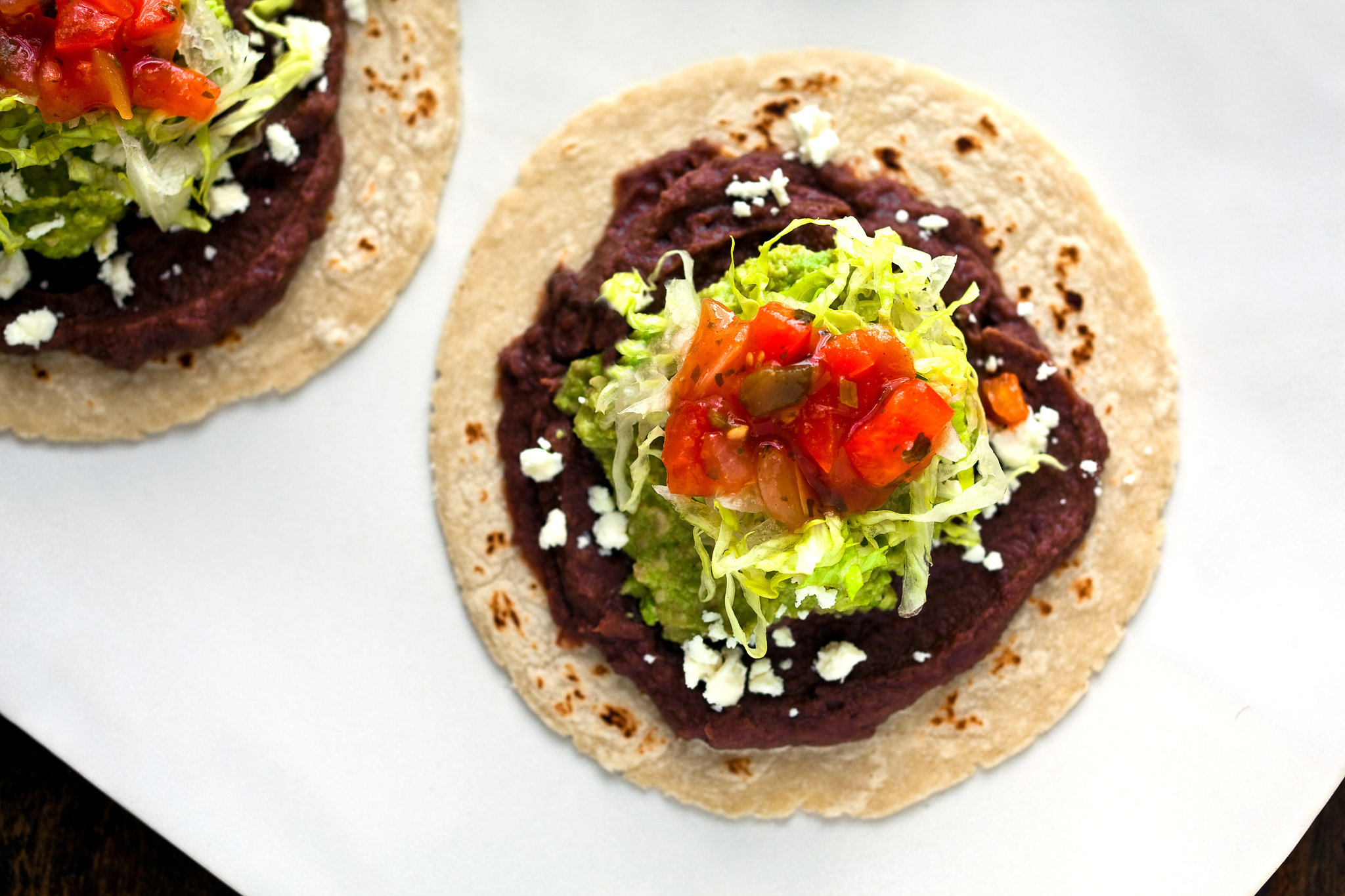 - Warm the refried beans in a 325-degree oven while you toast the tortilla halves. If the refried beans are too thick to spread evenly, thin out with some bean broth. Spread a spoonful of the refried beans onto each tortilla half. Top with a spoonful of the mashed avocado mixture and a sprinkle of queso fresco. Add a handful of lettuce and a spoonful of salsa. Arrange on a platter or plates and serve.