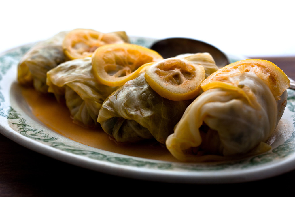 - Whisk together the lemon juice, remaining oil and tomato paste with 2 tablespoons water. Season to taste with salt. Pour over the cabbage rolls. Add enough water to barely cover the rolls and top with a layer of lemon slices. Invert a plate and place it on top of the rolls to keep them wrapped and in position. Bring to a simmer over medium heat, cover the pan, turn the heat to low and simmer for 45 minutes to an hour, at which point the cabbage leaves will be tender and the rice cooked. Remove from the heat and carefully remove the stuffed leaves from the water to a platter or to plates with a slotted spoon or tongs. Taste the liquid left in the pot and adjust the seasoning. Serve the rolls warm with the liquid from the pot as a sauce.