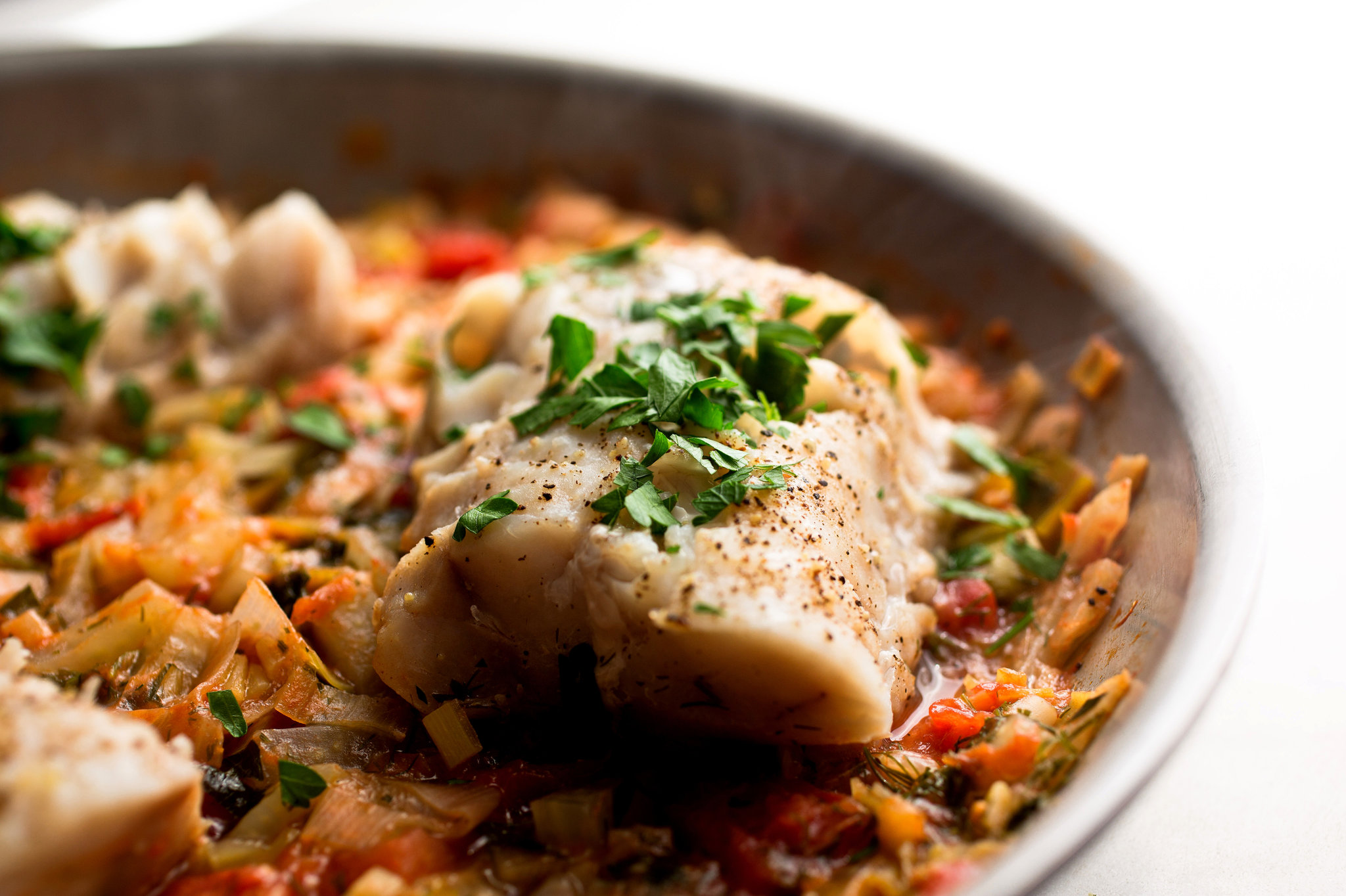 2. In a large lidded sauté pan that will accommodate all of the fish in one layer (see note below), heat the olive oil over medium heat and add the leeks. Cook, stirring, until they begin to soften, about 3 minutes, and add the garlic and a large pinch of salt. Cook, stirring, until the garlic is fragrant, about 30 seconds to a minute, and add the fennel. Turn down the heat to medium-low, cover the pan and cook, stirring often, until the fennel is tender, 10 to 15 minutes. Uncover the pan, add the tomatoes, salt to taste, and the pepper and cook uncovered, stirring often, for 10 to 15 minutes, until the tomatoes have cooked down and the mixture is thick and fragrant. Stir in the dill and 1 tablespoon of the parsley.