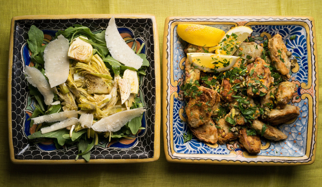 In Italy, a favorite way to serve fresh small artichokes is raw, dressed with oil and lemon. It couldn’t be a simpler presentation, and it’s sensational. Slice the trimmed artichokes as thinly as possible, then season and toss with fruity extra-virgin olive oil and lemon juice. Serve over arugula and add curls of Parmesan.