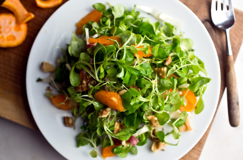 Mache, a delicate green with a mild, subtle flavor, packs quite a nutritional punch, as it is high in omega-3s (as are walnuts) and folic acid. The salad is simple to throw together, but its flavors are complex, with sweet juicy mandarin (or tangerine or clementine sections), crunchy bitter endive and walnuts, soft and almost sweet mache, and vibrant fresh herbs. The recipe will serve 4 to 6 but I admit to eating a good half of this salad when I tested it.