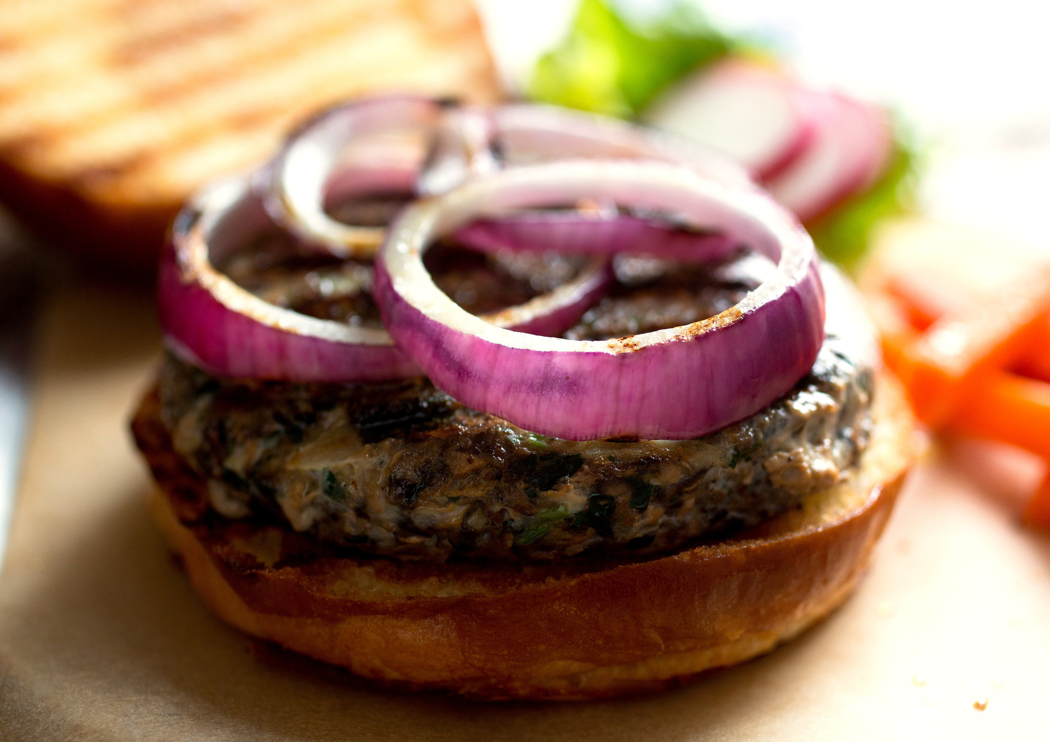 - In a large bowl, mix together the turkey, mushroom base, onion, garlic, chopped herbs, salt, baharat, cayenne and egg. Form 6 to 8 patties and place them on a plate or a lightly oiled sheet pan. Refrigerate for 30 minutes.