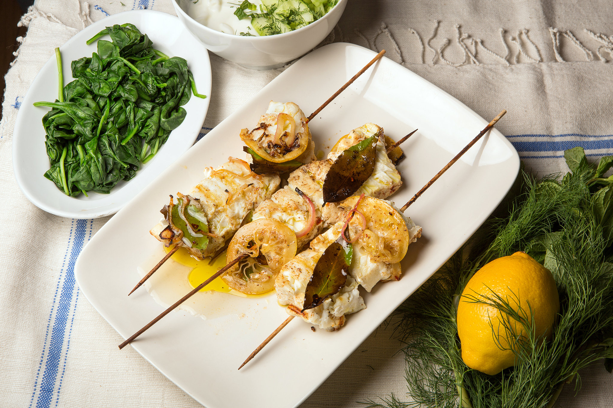 4. Heat a grill or broiler. When it is hot, cook skewers for about 2 minutes per side, until just opaque. (Leave some lemon, onion and bay leaf clinging to fish, so they char a bit.) Transfer to a serving platter. Sprinkle with remaining herb mixture. Serve with yogurt sauce on the side.
