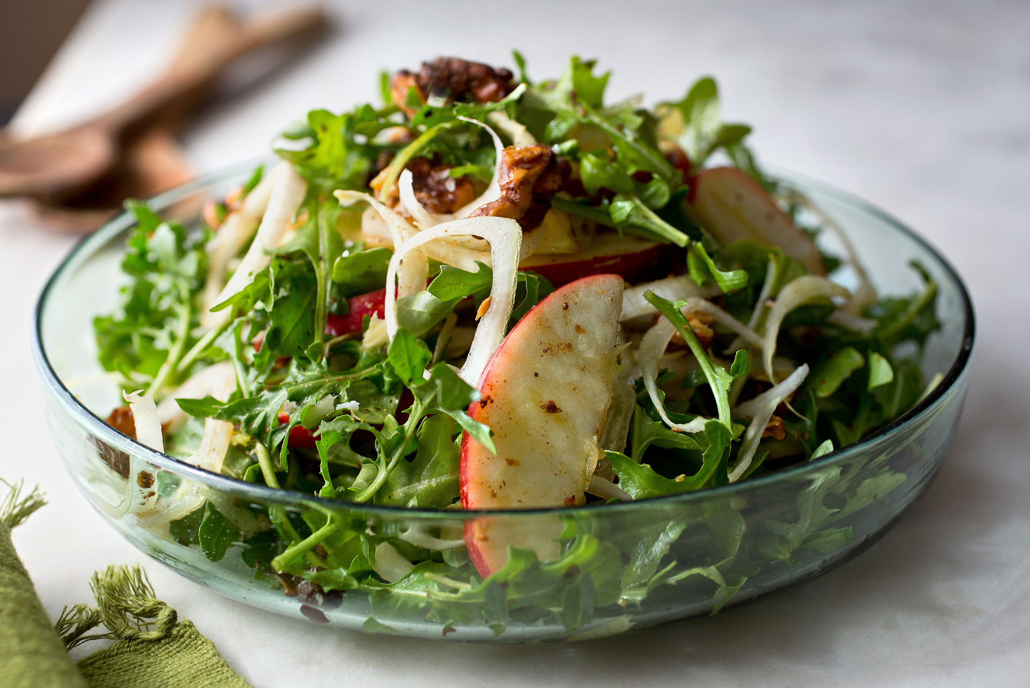 4. Put endive and arugula in a salad bowl. Add apple mixture and chopped nuts, and toss well. Season to taste with more salt and black pepper, and serve at once.