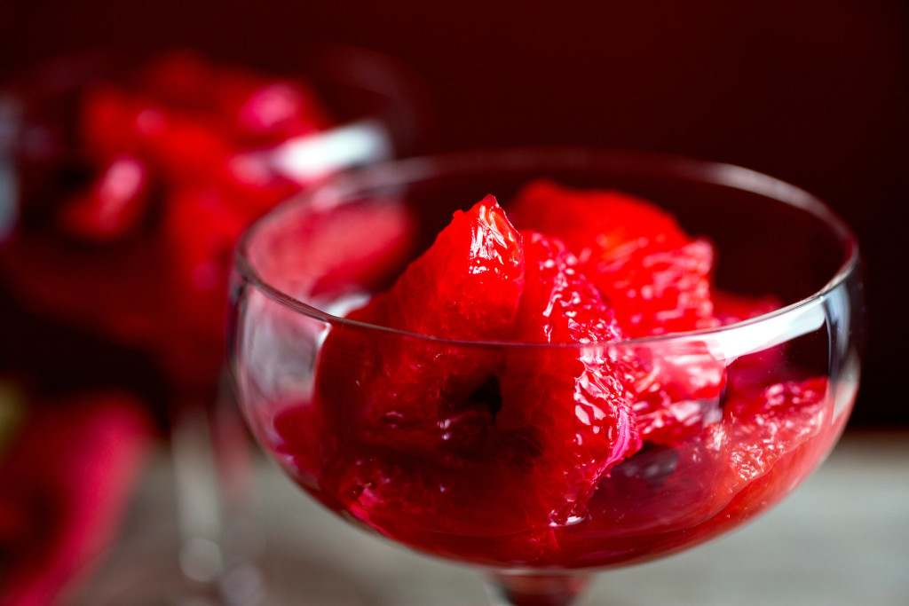 1. Squeeze the juice from two oranges, strain and set aside. Remove the peel and pith from the remaining oranges. The easiest way to do this is to cut away both ends of the fruit so that it sits flat on your work surface, then using a chef’s knife, utility knife or a paring knife, cut the skin and pith completely away from the fruit, following the natural curve of the fruit from top to bottom. Once peeled, remove the sections from between the membranes, holding the fruit over a bowl to catch the juice and slicing next to the connective membranes on one side of each citrus segment. Set the sections aside while you make the blood orange caramel syrup.