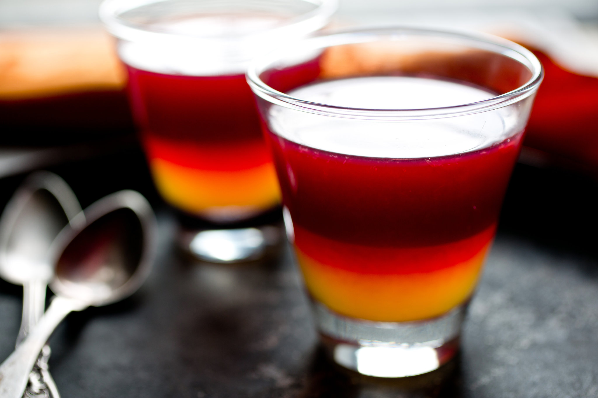 - Make the blood orange gelée. Juice all but one of the oranges and strain. Juice the remaining orange, strain out the seeds but not the pulp, and add to the strained juice. Place the gelatin in a medium bowl and pour in 1/4 cup of the water. Allow the gelatin to sit and “bloom” for 10 minutes. Combine the remaining water and the sugar in a saucepan and bring to a bare simmer. Simmer until the sugar has dissolved and remove from the heat. Pour over the gelatin mixture and stir until the gelatin has dissolved. Stir in the orange juice. Make sure that the lemon layers are set and fill the tumblers with the orange juice mixture. If you want, you can make different patterns, alternating stripes of orange and yellow, but you will have to allow each layer to set before you add the next one. Refrigerate for several hours, until set.