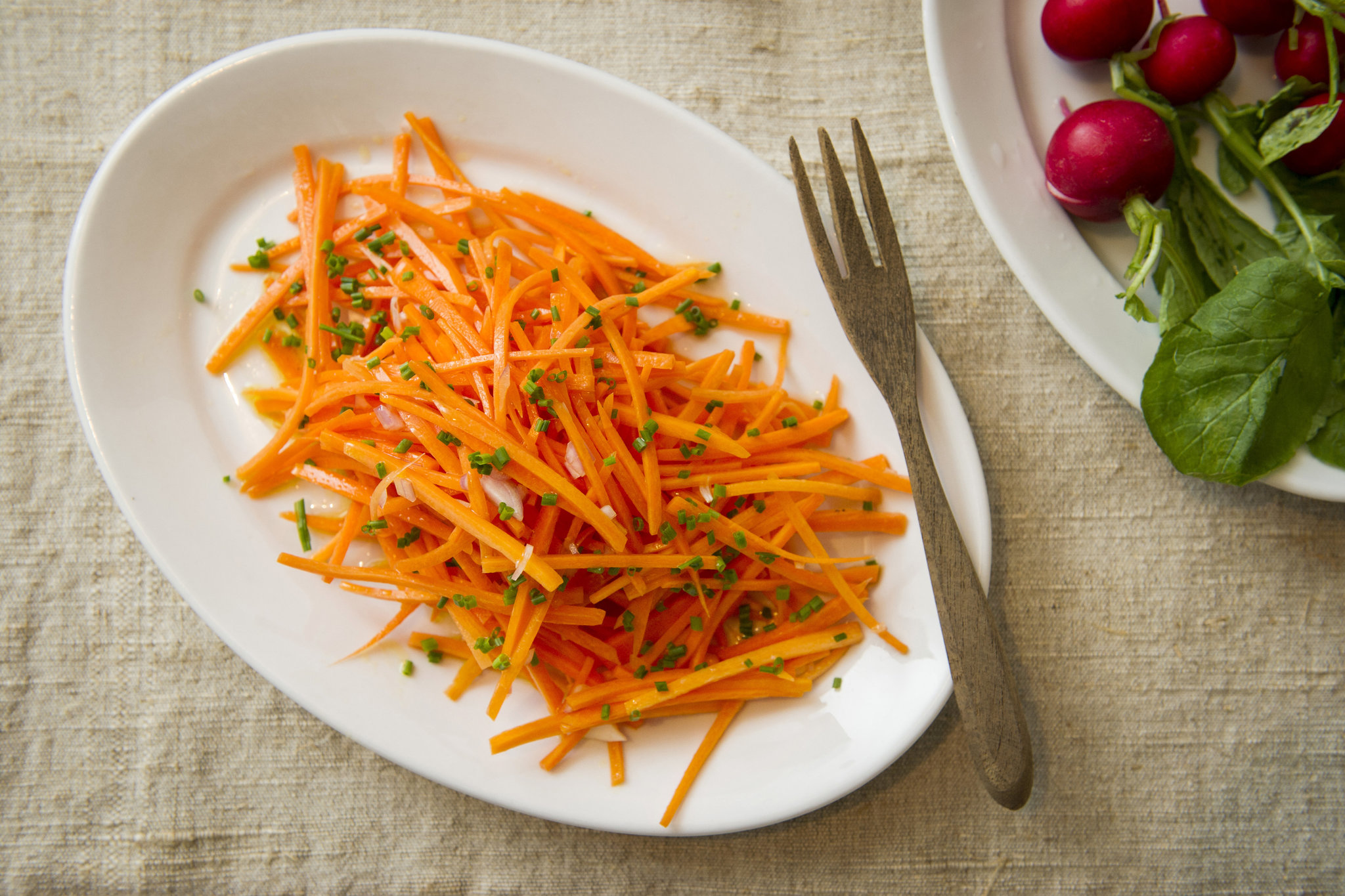 Sometimes a classic, masterfully executed salad is just what you want, and the easier the better. Enter this simple French salad, also known as called carottes râpées. It is grated carrots dressed with a simple vinaigrette; a lemony one works well. I prefer to cut the carrots into a fine julienne rather than use a box grater, which makes them a bit raggedy. The julienne carrots have a more appealing texture, and they look gorgeous piled on a platter, scattered with chives. It’s not necessary to stay absolutely traditional with this salad. I often veer North African with it, adding pinches of cumin, cinnamon and hot pepper. Nor would it be out of place to introduce Vietnamese seasonings like cilantro, mint, fish sauce and lime.