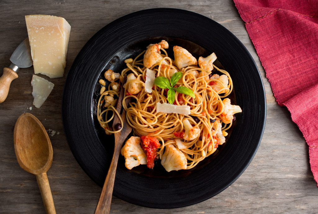 - Heat the olive oil over medium heat in a large, heavy skillet and add the garlic. Cook, stirring, until it smells fragrant, about 30 seconds to a minute, and add the anchovies and tomatoes. Turn the heat down to medium-low and cook, stirring often, until the tomatoes have cooked down and smell fragrant, about 10 minutes. Drain the raisins or currants and add, along with the saffron and its soaking liquid, cauliflower, pine nuts or almonds, and about 1/4 cup of the cooking water from the cauliflower. Season to taste with salt and pepper. Cover, turn the heat to low and simmer 10 minutes, stirring occasionally. Keep warm while you cook the pasta.
