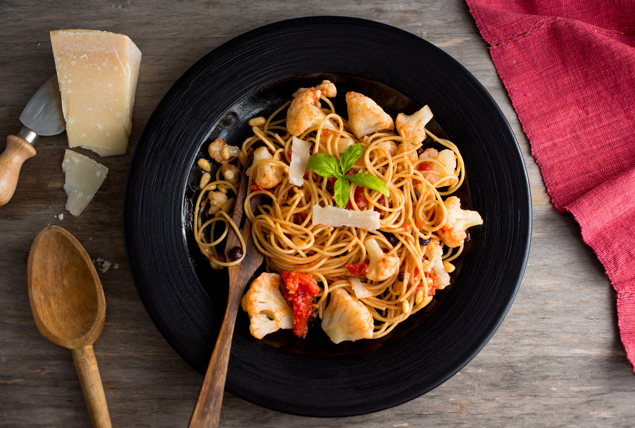 - Bring the cauliflower water back to a boil and cook the pasta al dente, following the timing instructions on the package. Check the sauce and if it seems dry add another 1/4 to 1/2 cup of the pasta cooking water. Drain the pasta and transfer to the pan with the sauce. Toss together and serve, sprinkled with pecorino and chopped basil leaves. If desired, drizzle a little olive oil over each serving.