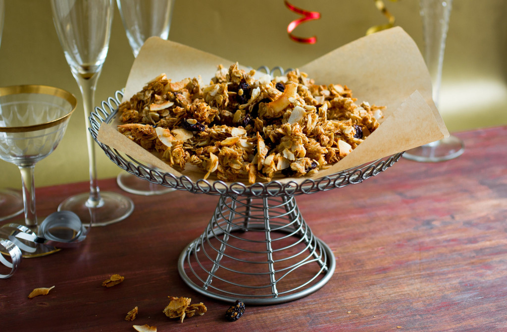 This somewhat clumpy granola isn’t too sweet, so you can feel a little virtuous when you snack on it. It is best to eat it soon after baking, while the clumps still hold; they will eventually fall apart once you put the granola in a jar, but there are enough right after you bake it to qualify it as snacking food in addition to breakfast. Don’t stir it when you bake it and when it is done let it cool completely on the baking sheet; that is the trick to clumping. The technique of leaving a “donut hole” in the middle when you spread the granola on the baking sheet comes from www.brighteyedbaker.com. It helps the granola bake evenly.