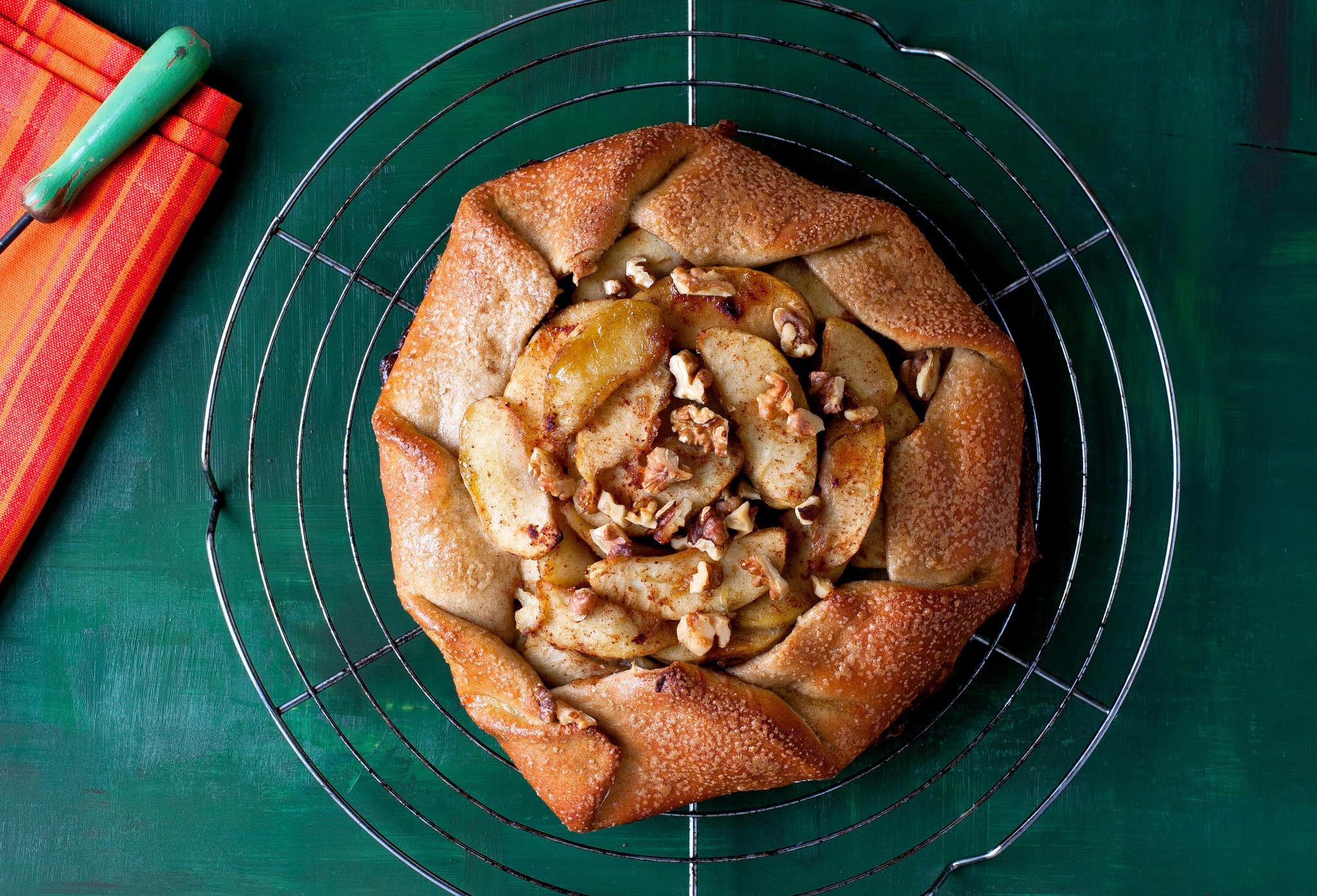 - Sprinkle the almond powder over the pastry, leaving a 2- to 3-inch border all around. Place the apples on top. Fold the edges of the dough in over the fruit, pleating the edges as you work your way around the fruit to form a free-form tart that is roughly 9 inches in diameter. Place in the freezer on the baking sheet for 45 minutes to an hour. This helps the galette maintain its shape.