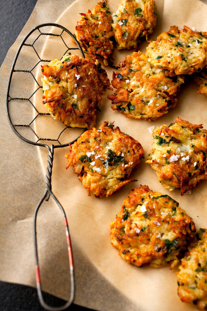 - Heat 2 tablespoons oil in a large sauté pan over medium-high. Take a heaping tablespoon of the mixture and flatten between your palms. Fry latkes, without moving them, for 4 to 5 minutes, checking that they don’t over-brown. (You should be able to fry them in batches of 11 to 12, depending on pan size.) Flip latkes, turn heat down to medium-low and fry another 4 minutes, or until well browned and tender. Transfer to a baking sheet lined with paper towels. Sprinkle with additional salt. Serve warm.