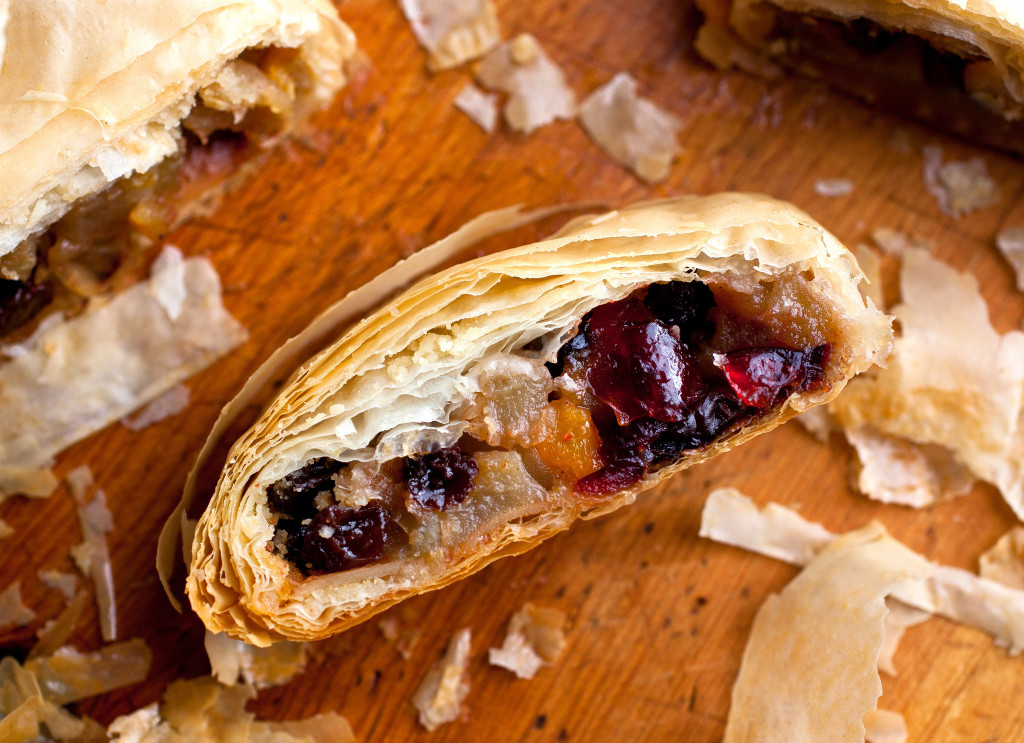 This strudel is made with phyllo dough. When I tested it the first time, I found that I had enough filling for two strudels. Rather than cut the amount of filling, I increased the number of strudels to 2, as this is a dessert you can assemble and keep, unbaked, in the freezer.
