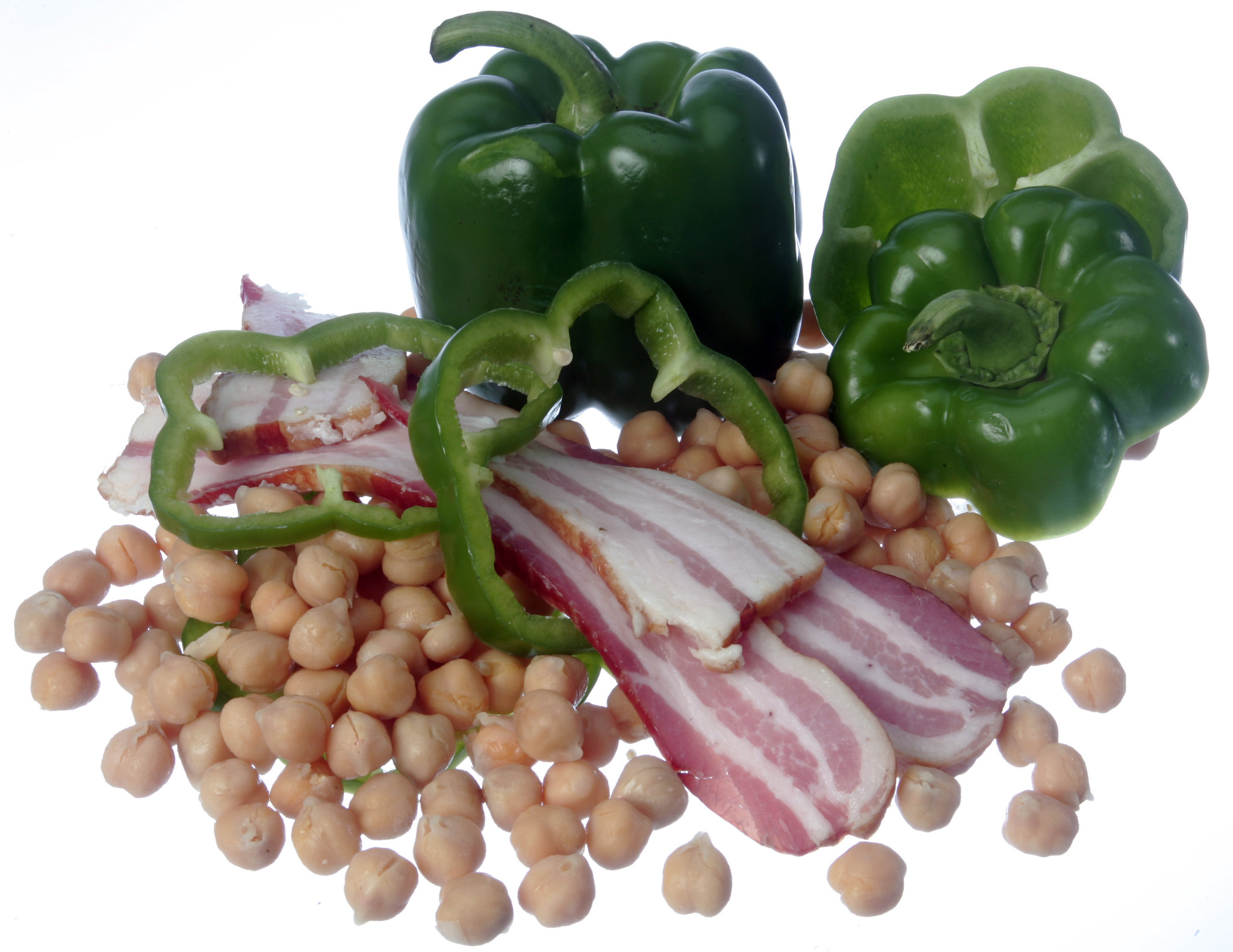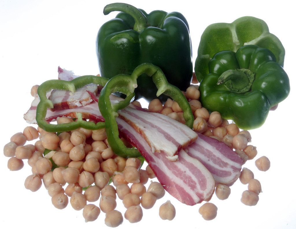 - Reduce heat to low. Add peppers, onion and garlic and sauté until soft. Return bacon to pan, add remaining 1/2 teaspoon paprika and cook, stirring, for a minute. Stir in marjoram, chickpeas and stock. Simmer, covered, about 30 minutes, until sauce has reduced and intensified. Stir in vinegar. Put pork in casserole, baste with sauce, cover and cook about 20 minutes, until done just shy of medium (an instant-read thermometer should register 130 degrees in the center of the meat; the temperature will increase as the meat rests).