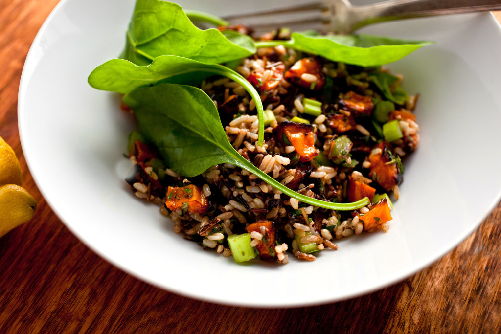- Combine the wild rice, squash, herbs and celery in a large bowl. Toss with the dressing. Add salt and pepper to taste. Line a platter, individual plates or a wide salad bowl with the baby spinach or arugula. Top with the salad and serve