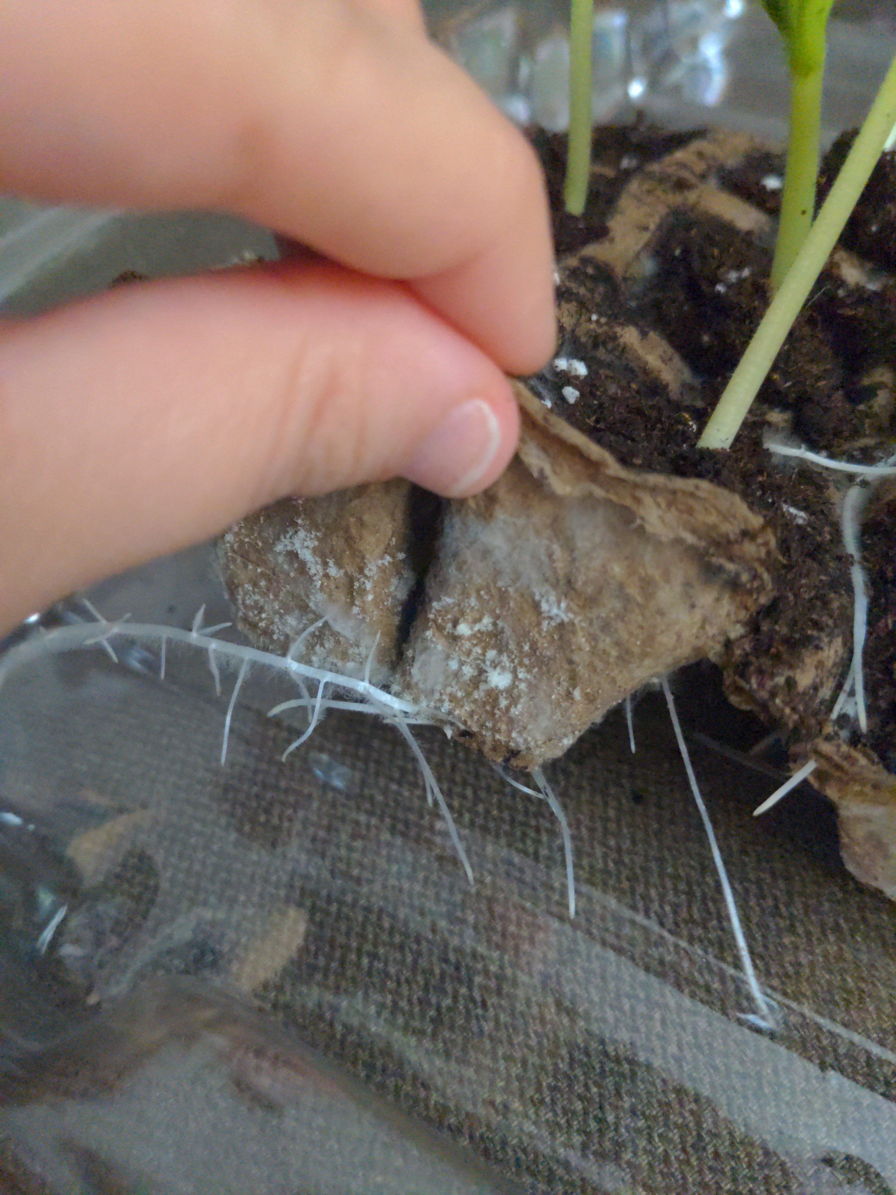 Zucchini plants have this weird white fuzz on the Bottom of the container and roots. Doesn’t smell like mold or anything. Is it okay to transplant or did I do something wrong and it’s gone “bad”?