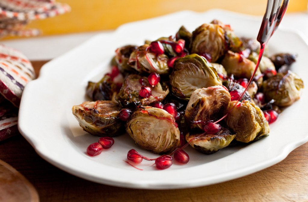 3. Drizzle the reduction over the brussels sprouts and sprinkle with the pomegranate seeds.