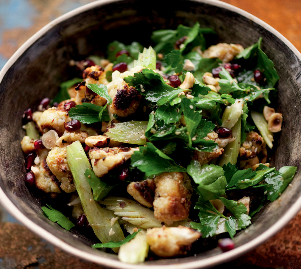 The roasted flavors of cauliflower and hazelnuts, combined with the fresh pop of pomegranate seeds, make this a particularly memorable salad for your holiday table. Cauliflower and pomegranate are popular foods in both Arab and Jewish communities, and the sweet and sour combinations in this dish capture the flavors of the region.