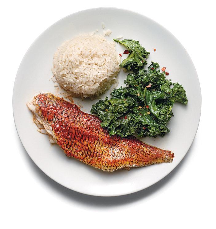 - Using a flexible metal spatula, gently remove the four fillets from the two fish. Serve skin-side up, with sauce on the side, along with white rice and sauteed kale.