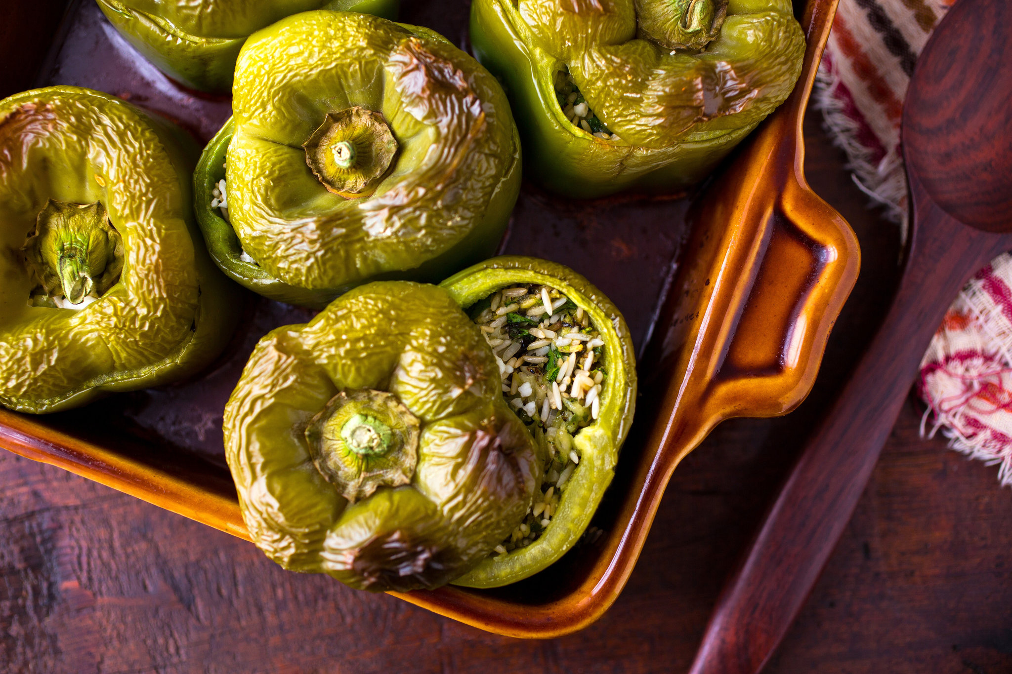 I used a medium-grain rice that I buy at my local Iranian market for these peppers. The package says that the rice is great for stuffing vegetables because it doesn’t swell too much, and it’s right. It goes into the peppers uncooked and steams in the oven, inside the peppers (so it’s important to cook them long enough and cover the baking dish). Make sure that you spoon the sauce left in the baking dish over the rice once the peppers are done. These are good hot or at room temperature. I like to use green peppers.