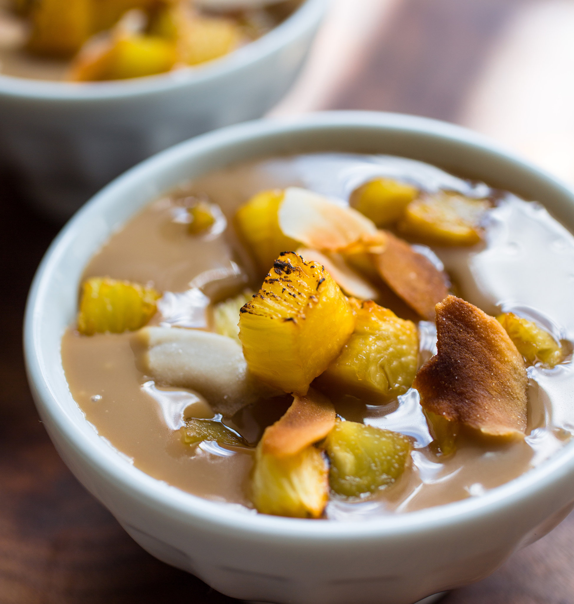 5. Spoon dulce de leche into 6 ramekins. Top each with warm pineapple and toasted coconut; sprinkle with salt if using and serve.
