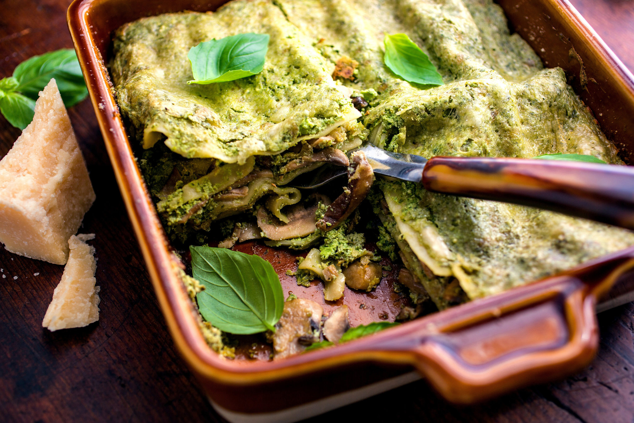 - Preheat the oven to 350 degrees. Lightly oil a rectangular baking dish with olive oil. Spread a small spoonful of the ricotta mixture in a thin layer over the bottom of the baking dish. Top with a layer of lasagna noodles. Top the noodles with a thin layer of ricotta, spooning on a few dollops then spreading it with an offset or a rubber spatula. Top the ricotta with half the mushrooms, and sprinkle Parmesan over the mushrooms. Repeat the layers, then add a final layer of lasagna noodles topped with ricotta and Parmesan. Make sure that the noodles are covered with ricotta and that there are no dry exposed edges. Drizzle a little bit of olive oil over the top.