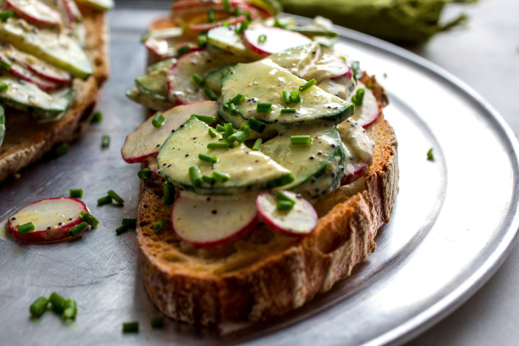 This is based on a recipe from Mark Peel’s “New Classic Family Dinners.” Slice the cucumbers and radishes as thin as you can. I use an inexpensive plastic Japanese mandolin for this. (Make sure to use the guard so you don’t cut your fingertips!) I eat this as a salad and also as a delicious bruschetta or crostini topping.