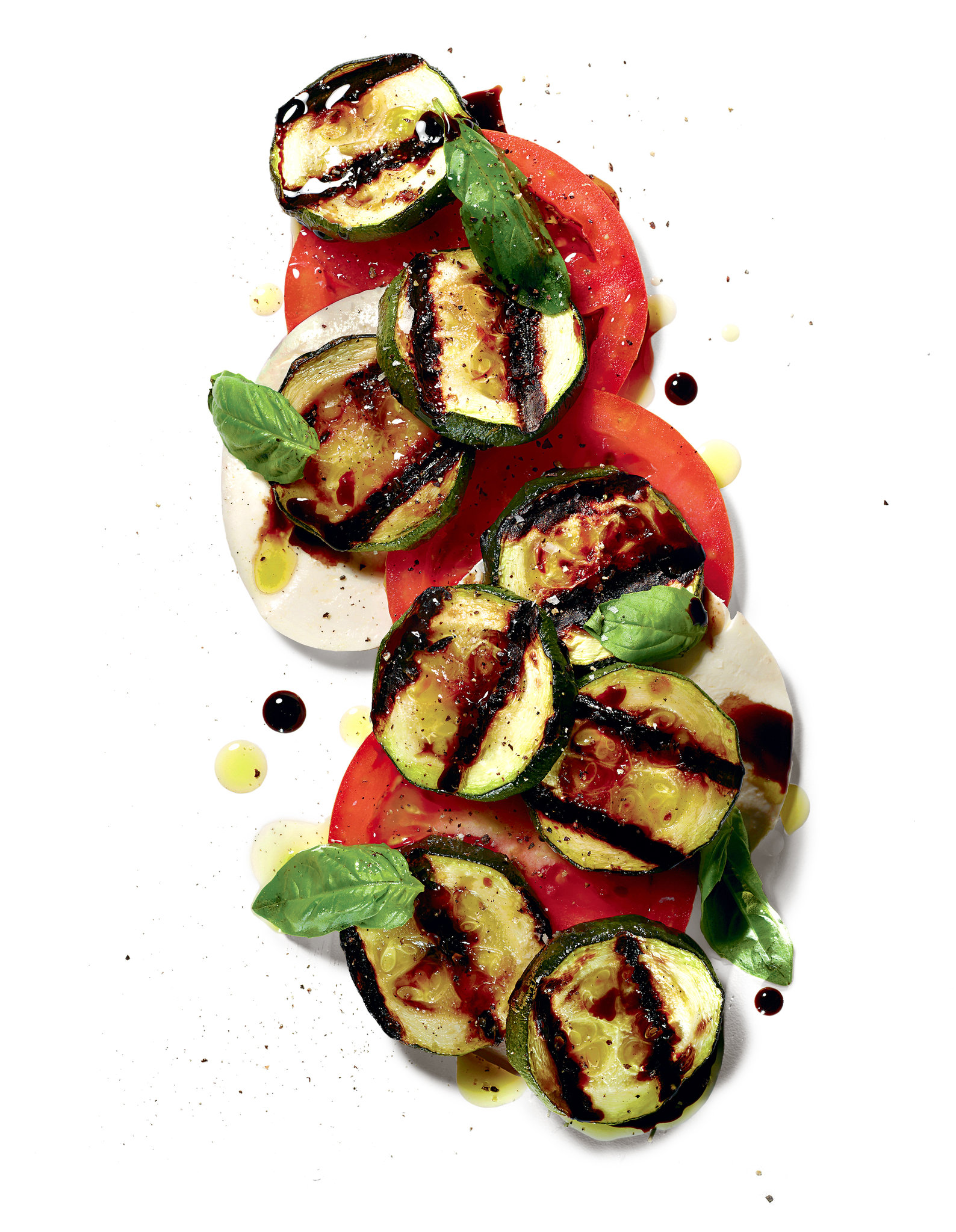- Toss (or layer) with the zucchini, and drizzle with balsamic vinegar and olive oil; season with salt and pepper.
